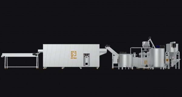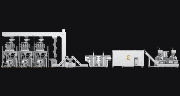 Corn chips production line project for 200 kg equipped with a three-layer oven and three volumetric filling machines